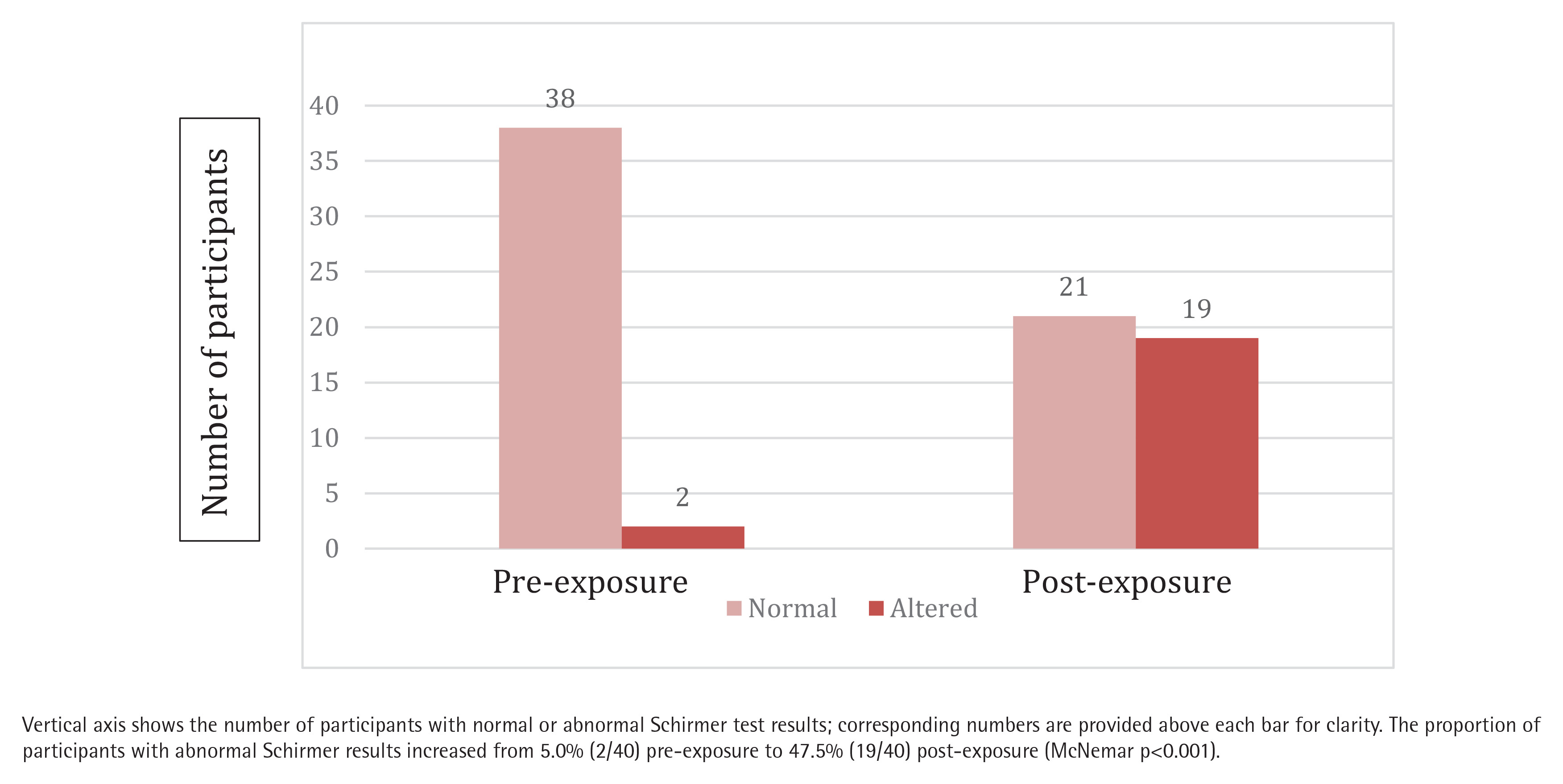 In the ophthalmological assessment, a significant functional impairment was observed following acute EC exposure. According to the McNemar test, the proportion of subjects with abnormal Schirmer results increased significantly from 5% pre-exposure to 47.5% post-exposure (p<0.001) (Figure 1).