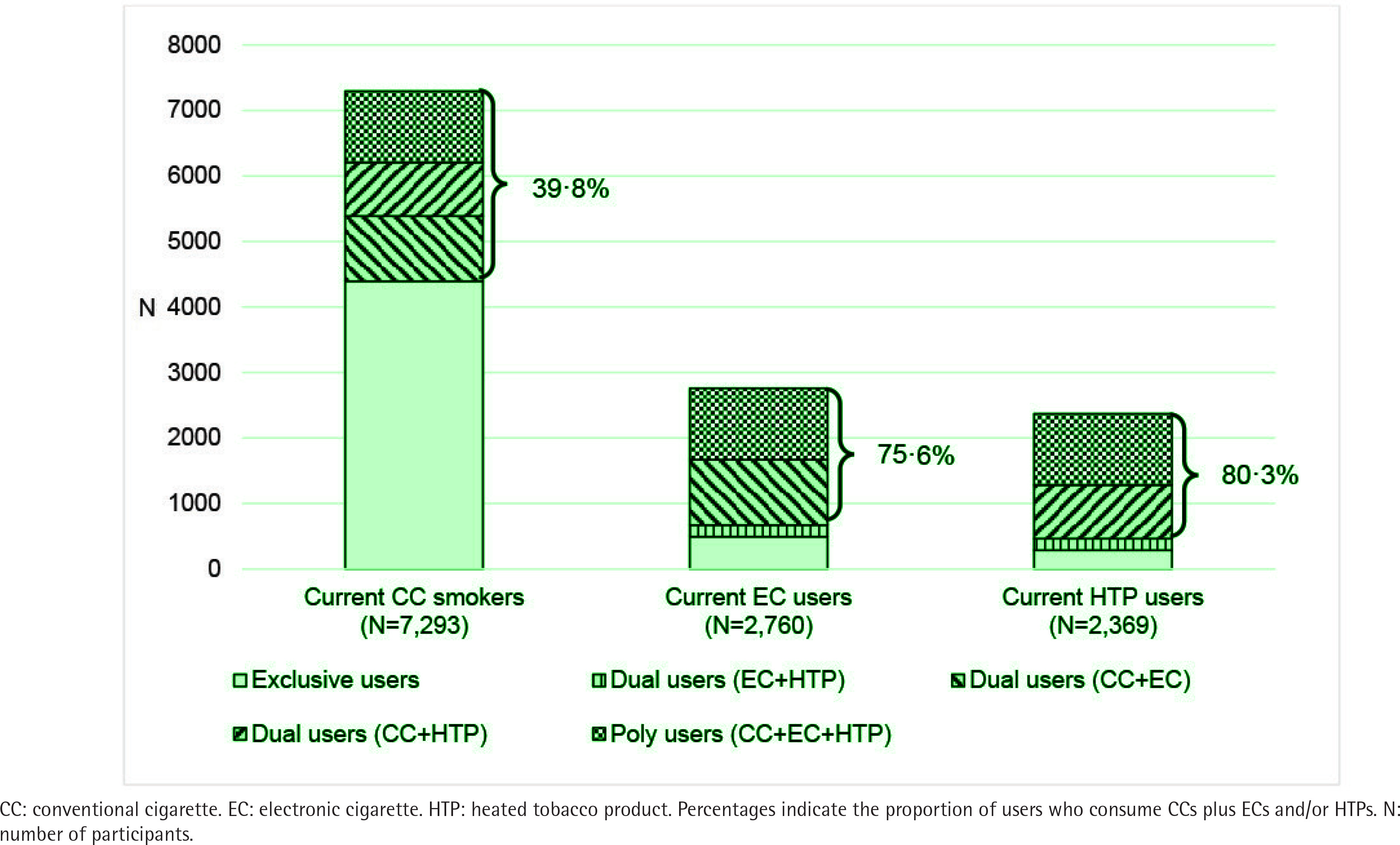 Patterns of exclusive and combined CC, EC and HTP use are detailed in Figure 1 and Supplementary file Table 2. Out of 7293 current smokers of CCs, 60.2% were exclusive smokers of CCs, of 2760 current EC users 17.9% were exclusive users of ECs, and of 2369 current HTP users 12.1% were exclusive users of HTPs. Overall, 82.1% of EC users and 87.9% of HTP users, were dual or poly users. In particular, 75.6% and 80.3% of EC and HTP users, respectively, reported also using CCs. Among CC smokers, the average number of CCs smoked per day was 10.7 and did not significantly differ between exclusive, dual and poly users.