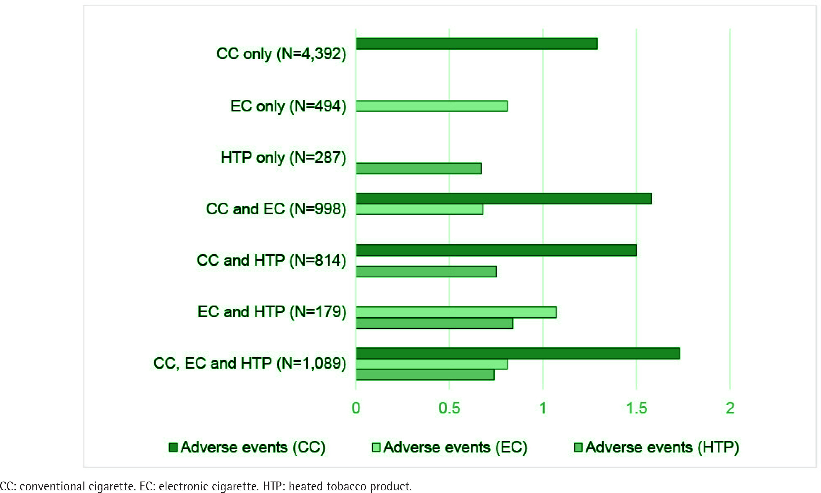 Among CC smokers, mean number of different adverse events for CC smoking increased from 1.29 (SD=1.36) for exclusive CC smokers to 1.65 (SD=1.61; p<0.001 compared with exclusive CC smokers) for those also using ECs, 1.63 (SD=1.61; p<0.001) for those also using HTP, and 1.73 (SD=1.69; p<0.001) for those using EC and HTP (Figure 2; and Supplementary file Figure 2). In multivariable models adjusted for age, sex and smoking intensity, CC smokers also using EC (AOR=1.32; 95% CI: 1.17–1.50), also using HTP (AOR=1.14; 95% CI: 1.01–1.30) and also using both EC and HTP (AOR=1.50; 95% CI: 1.29–1.75) had a higher likelihood of experiencing at least one adverse event compared to exclusive CC smokers (Supplementary file Table 3)19.