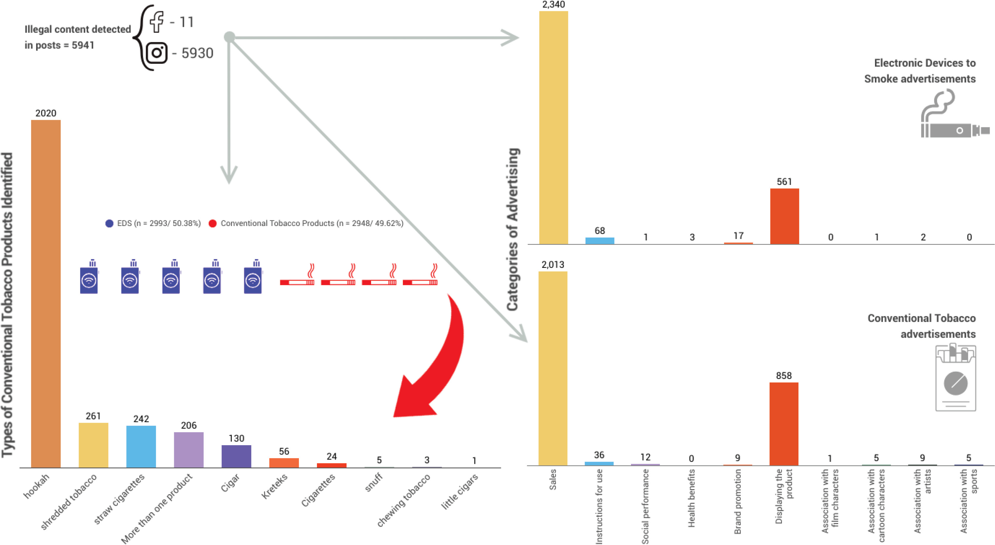 Illegal URLs were categorized (coded) according to the product advertised and the nature of the advertisement as follows: sale of products (where prices and purchase contacts are provided, even if accompanied by any other elements); display of products (posts that merely showcase the products, without including any promotional text, pricing information, contact details for purchase or any other elements); use or instruction in the use of the product (cases where the URL had images of people using or teaching how to use the product); brand promotion (where only the brand logo is displayed, without any accompanying product image or other element); social performance/sexuality (associated with elements of financial, social, sexual, or romantic success); health benefits or harm reduction, association with films (this includes non-human characters, movie posters, and actors portrayed as specific characters, assuming no additional elements such as pricing information are present); cartoons (including cartoon elements on the packaging is acceptable, with no other elements such as pricing information, health claims, or references to social performance); celebrities (including actors, but not characterized as a specific character); and sports (including sport elements on the packaging is acceptable, with no other elements such as pricing information, health claims, or references to social performance).