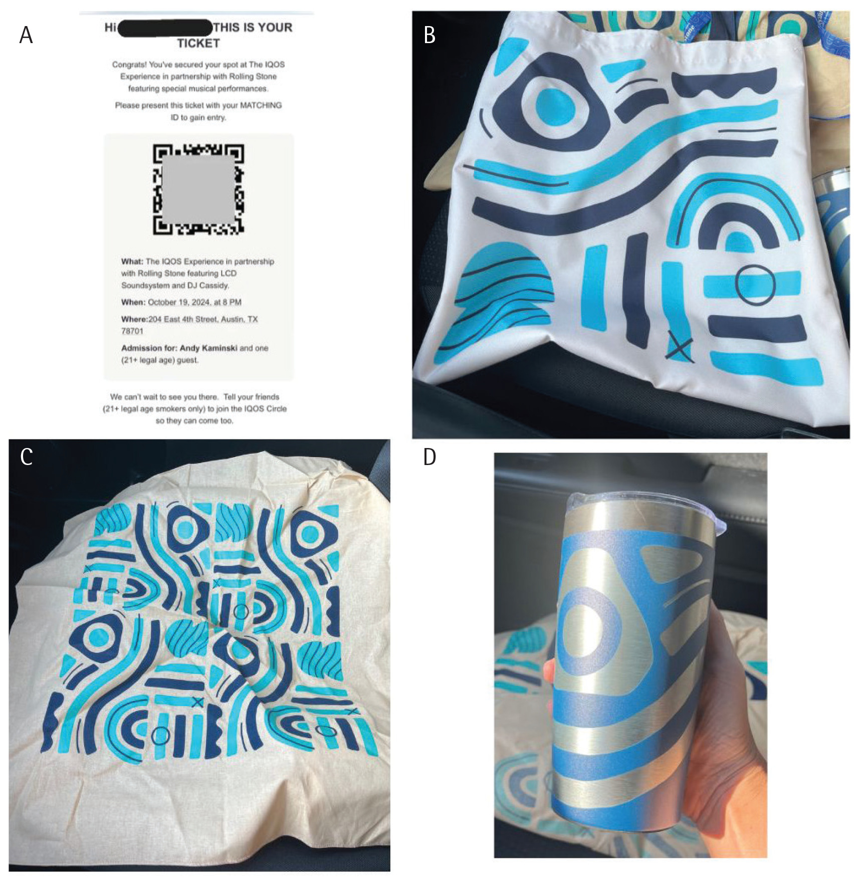 The first promotional event occurred on 19 October 2024: ‘The IQOS Experience in partnership with Rolling Stone featuring LCD Soundsystem and DJ Cassidy’. Using ‘mystery marketing’ techniques, an Austin-focused Instagram account6 posted a since-deleted, cryptic message about an upcoming ‘pop-up’ show by a Grammy Award-winning artist, directing viewers to the IQOS Circle website to join and claim two free tickets. Attendees entered the venue in small groups, observing an IQOS promotional pitch from PMI representatives before entry. No IQOS branding presence existed within the venue, although there were free promotional items (a bandana, a tote bag, and an insulated tumbler) in IQOS colors (Figure 1A-1D). Later events included more explicit promotional branding, including display cases of IQOS devices with PMI representatives inviting discussion and questions. Examples of promotional events included a premiere of the documentary ‘Row of Life’ (with free passes for local canoe/kayak rental), seasonally themed parties (e.g. an ‘après ski’ holiday party in December 2024), and Austin-themed local events (e.g. live music and tequila tasting during a custom leatherwork/stamping clinic). At each event and on social media, representatives promised that IQOS would be ‘coming to Austin soon’, though attendees could not yet use or purchase the product at events. Additionally, two standing downtown Austin ‘pop-ups’ offered a ‘sneak peek of the product and chat with IQOS experts’, described as a ‘look and touch’ experience.