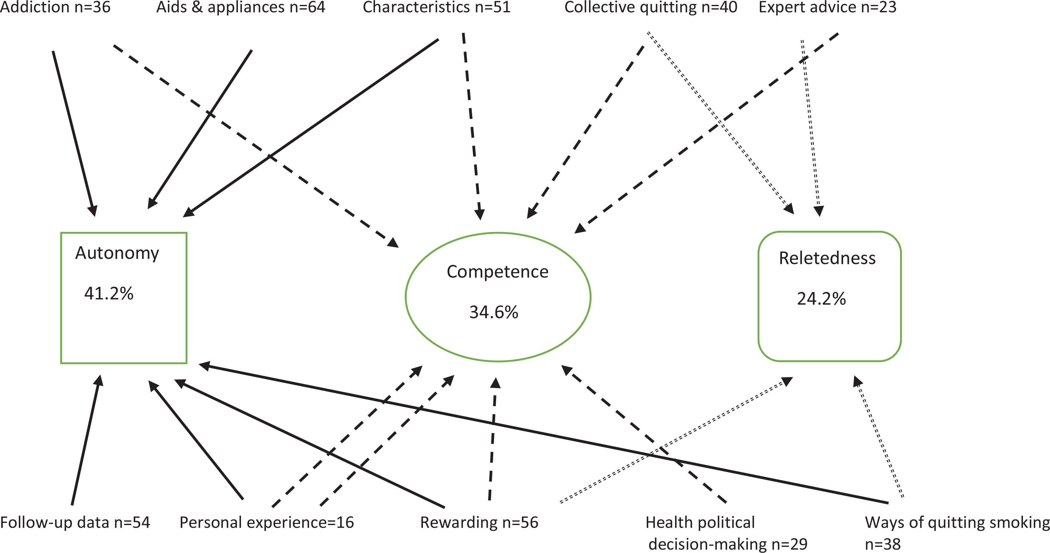 According to the respondents, successful smoking cessation is most likely when the person quitting has autonomous motivation. External pressure alone is not enough for a lasting change. The three basic psychological needs of autonomy, competence, and relatedness were prominently reflected in the responses across ten upper categories. Of these, the need for autonomy appeared the most frequently.