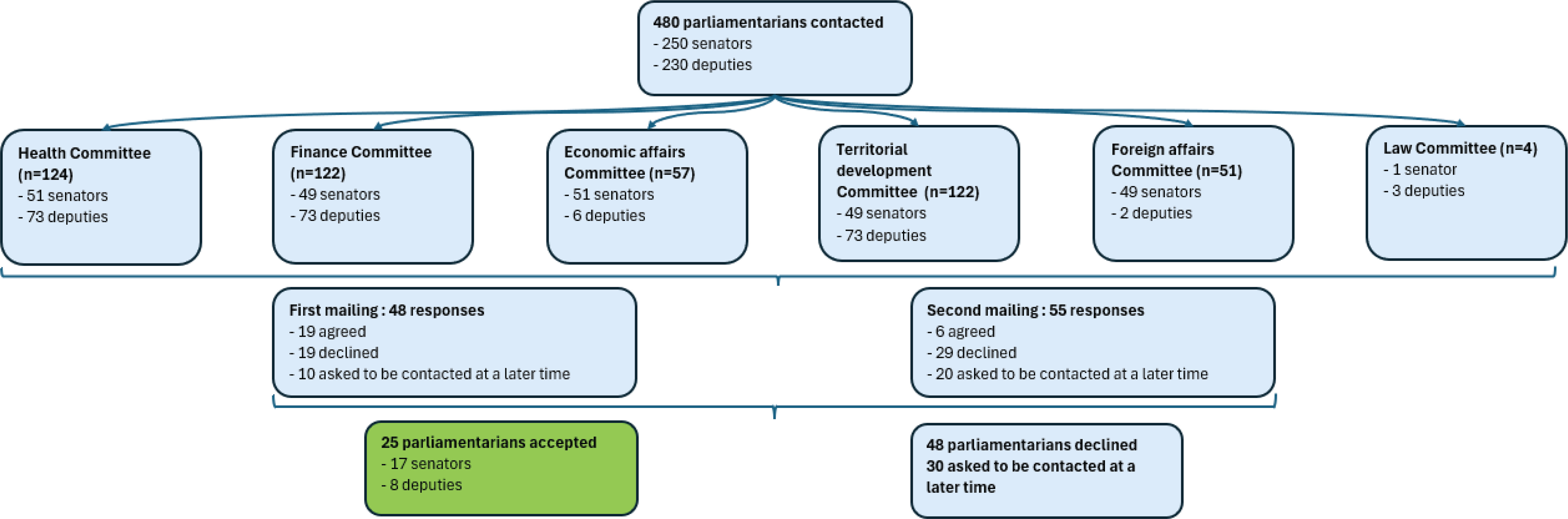 All current French deputies and senators were eligible to participate. Potential participants were contacted using their publicly available email addresses listed on the websites of the French National Assembly and Senate (https://www.assemblee-nationale.fr; https://www.senat.fr). We initially targeted members of the health and finance committees (146 deputies and 100 senators), believing they may be potentially more likely to agree to an interview, before expanding to other committees. In total, we contacted 230 deputies (out of 577) and 250 senators (out of 348) (Figure 1), representing 51.9% of French parliamentarians.